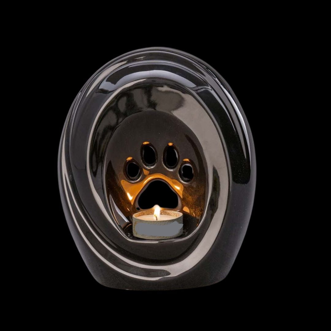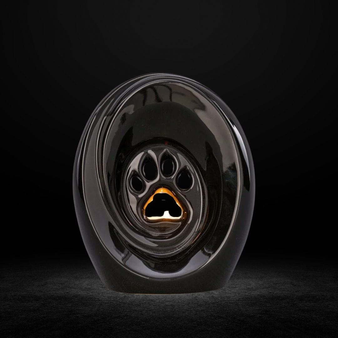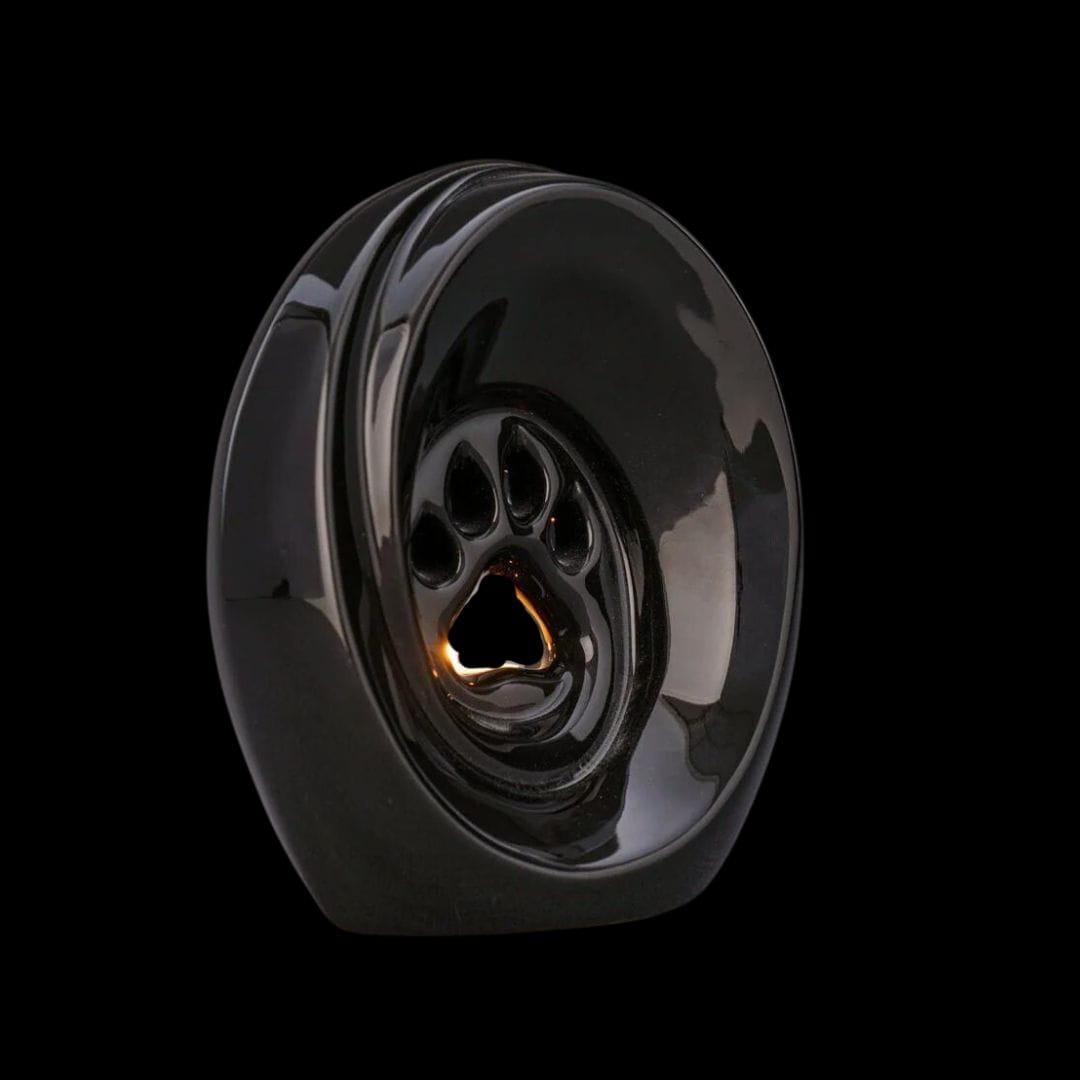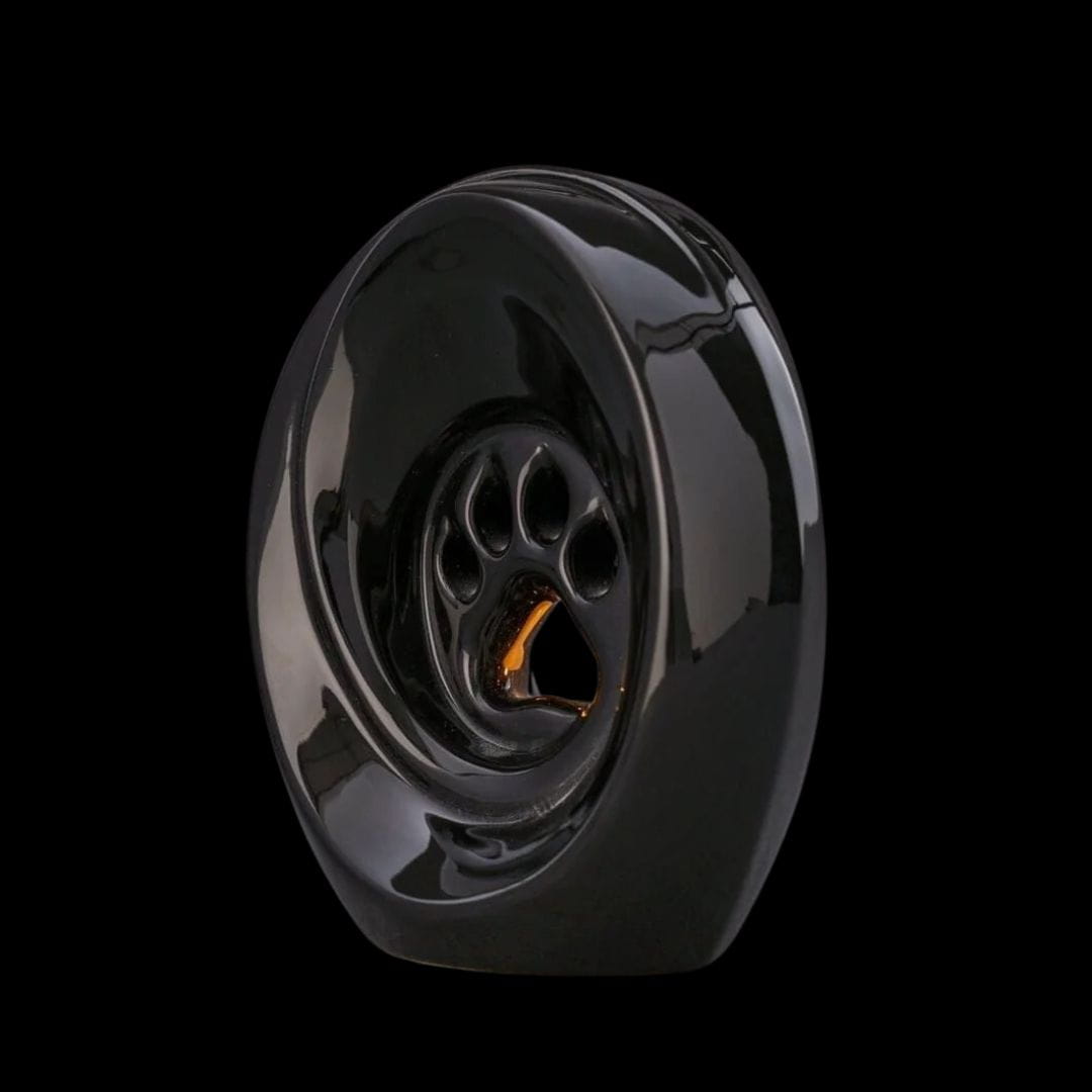 This is an elegant and symbolic piece crafted from high-quality ceramics. The glossy black finish lends the urn a refined character, while simultaneously emphasizing the solemnity and respect accorded to a beloved pet. The central feature of the urn is a decorative paw print, serving as a symbol of the bond and memory of the departed companion. The urn also includes a space for a tealight or a small candle with a diameter of 3.5 cm, allowing for the lighting of a symbolic flame of remembrance. The candlelight gently reflects off the urn’s interior, creating a warm, subtle glow that enhances its symbolism and imbues the urn with a unique, contemplative aura.