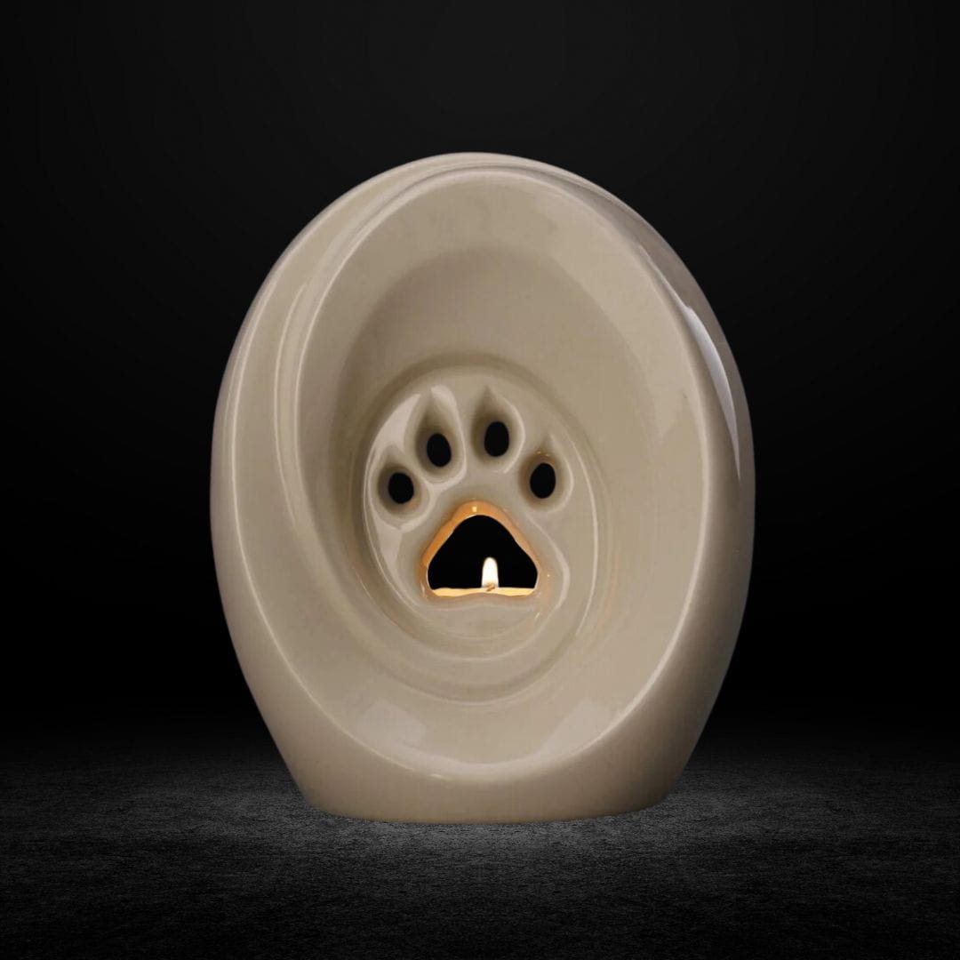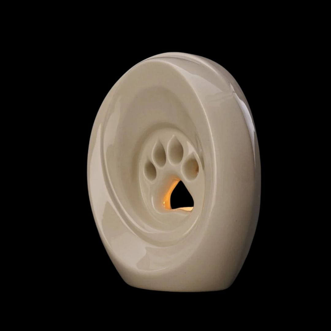 The urn features a softly rounded, oval shape that provides visual harmony and aesthetic balance. The paw motif—symbolizing lasting memories and footprints left on the heart—has been centrally positioned to draw attention and emphasize the urn’s role as a symbol of remembrance. The lower section of the urn is designed to hold a small candle, bathing the urn in a warm, spiritual glow.
