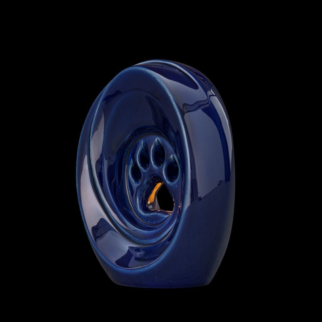 The ceramic cremation urn with cobalt metallic glaze is a tribute to a beloved pet. Its elegant design, paw motif and functionality make it not only a beautiful but also deeply symbolic object. It is a perfect choice for those who wish to honor the memory of their pet in a unique way.