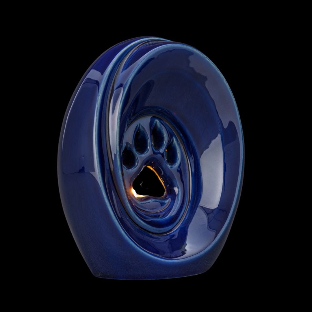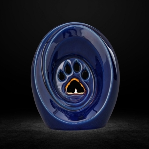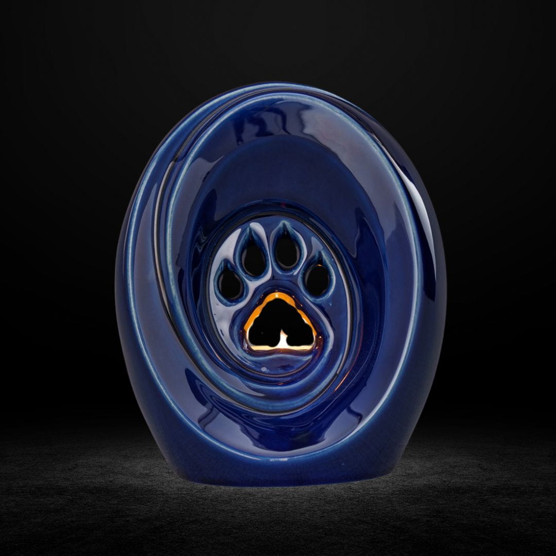 This ceramic urn is more than just a container for a beloved pet’s ashes—it is a symbol of memories, love, and a special bond. The candlelight softly illuminating the paw print motif allows for a personal tribute to the animal companion, emphasizing their irreplaceable place in the owner’s heart.