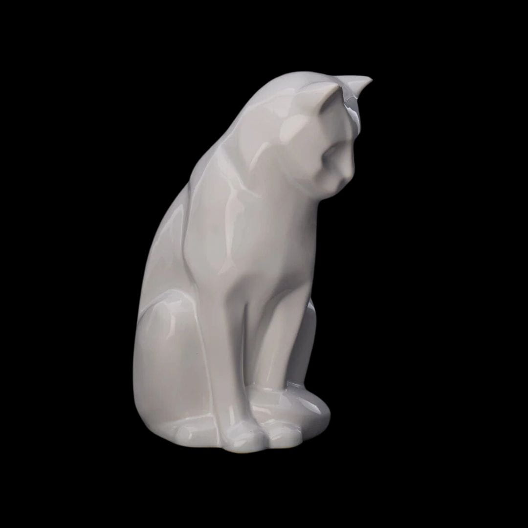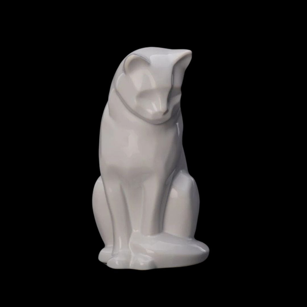 The urn is designed in the form of a seated cat, gazing forward with grace and quiet dignity. Finely rendered features—such as delicately shaped ears, subtly formed paws, and a beautifully sculpted tail wrapped around the body—lend the piece both realism and artistic expression. The cat’s eyes, though stylized, convey a sense of deep calm, symbolizing eternal rest. The proud and graceful posture of the feline reflects majesty and loyalty—qualities often associated with our beloved pets.