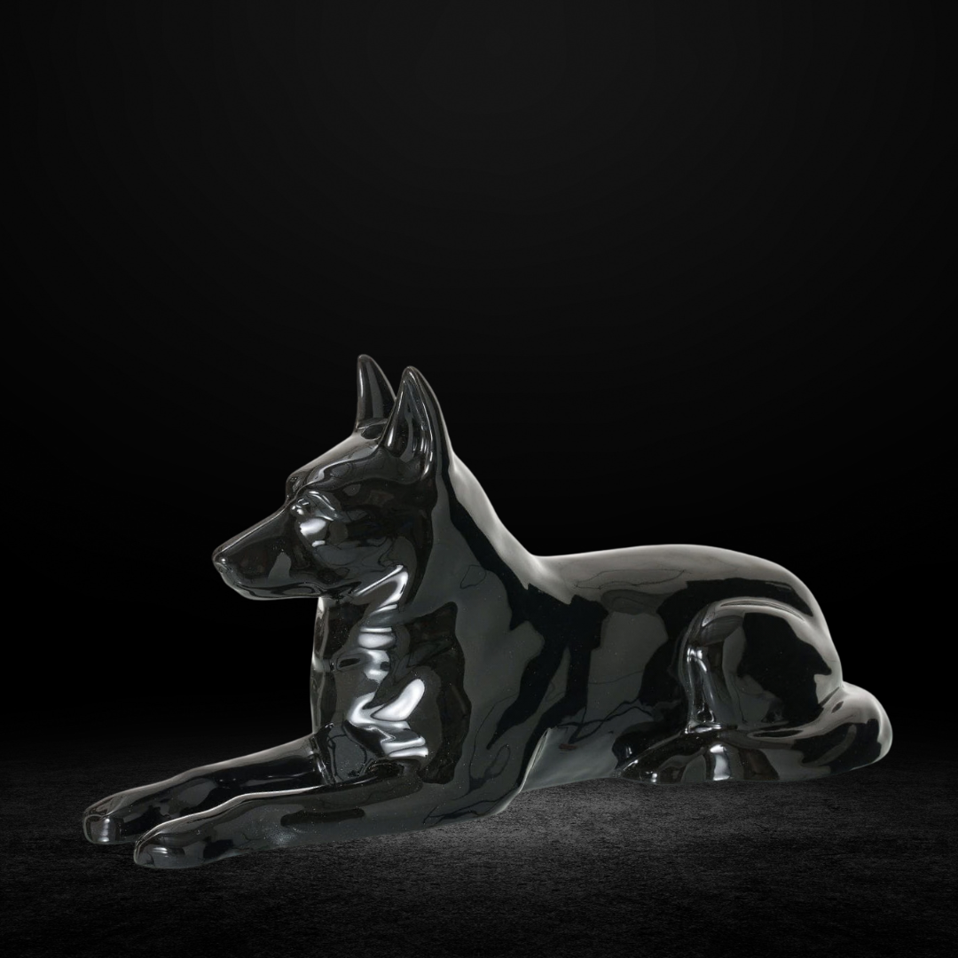 The urn is coated in an intense black glaze with a subtle sheen. The polished surface reflects light softly, accentuating the curve of the back, the form of the paws, and the detailed features of the muzzle. This interplay of light enhances the three-dimensional quality of the sculpture, giving it remarkable depth and definition. The black finish lends the urn a modern yet timeless character. It complements minimalist interiors, contemporary spaces, and classic settings alike. Black requires no additional embellishment - it stands as a powerful symbol of reverence and remembrance.