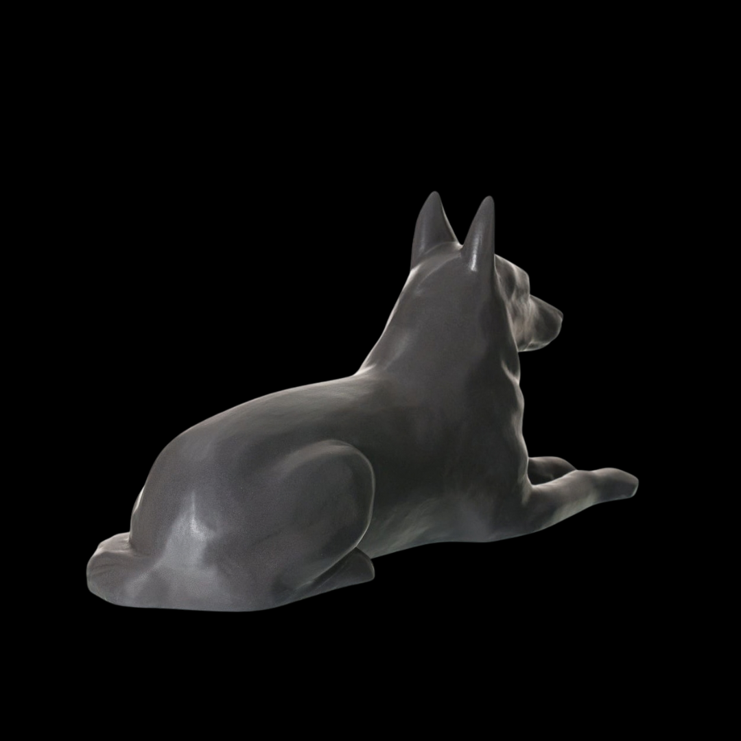The German Shepherd is portrayed lying down with its front legs extended and head gently raised. This is a posture of watchfulness - dignified, composed, and loyal. The figure feels peaceful yet present, symbolizing a bond that does not fade with time.