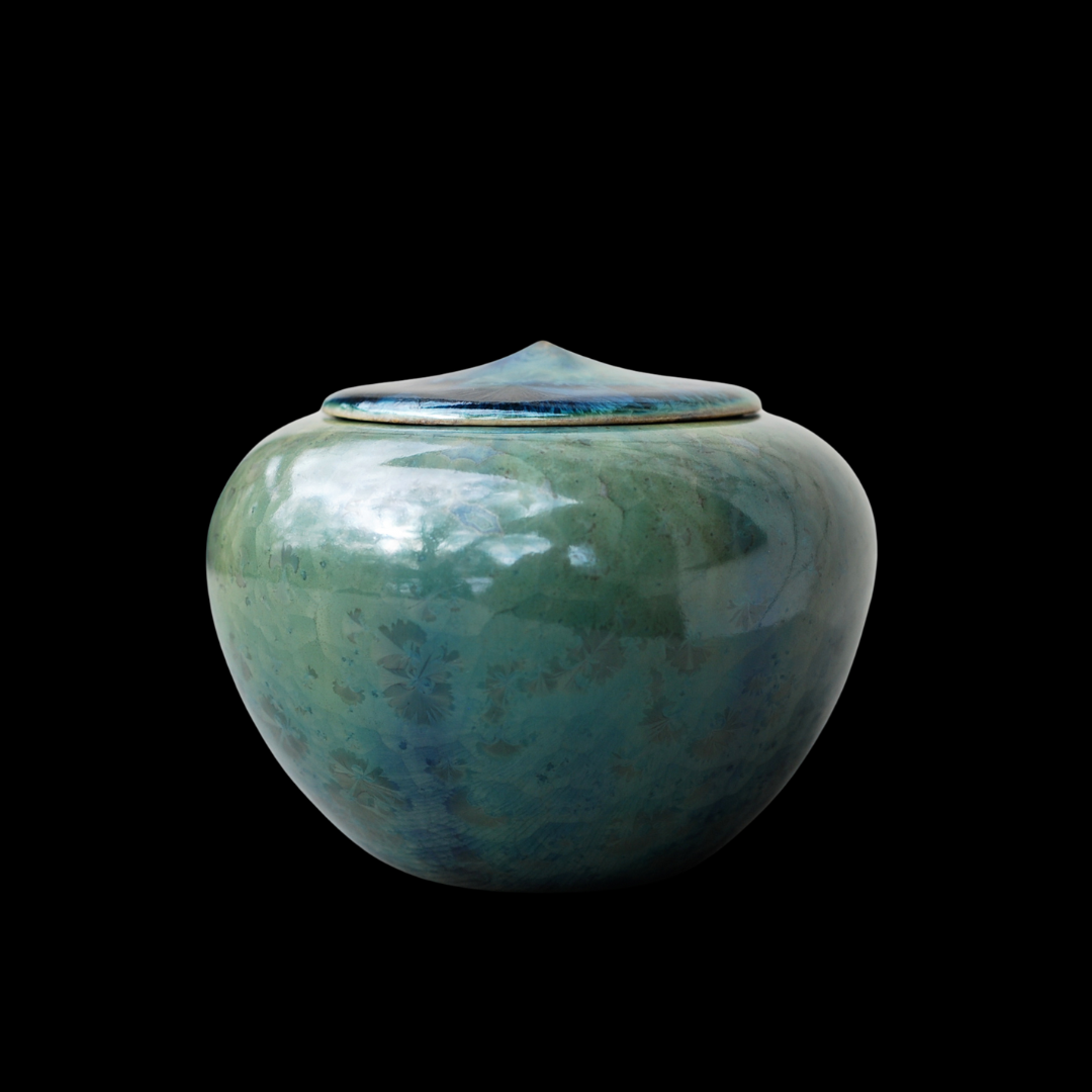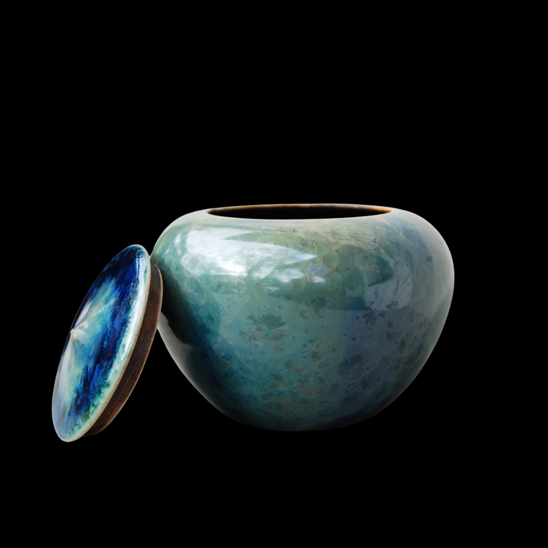The uniqueness of each urn is emphasized by the unique glazing – original crystal glazes, composed according to our own recipes. The glazing process creates a rich, unique network of crystals on the surface of the urn, which in shades of blue and green create organic, fluid patterns. Their density adds depth, reminiscent of water stirred by a light wind or subtle reflections of light on tree leaves. Thanks to the unpredictable nature of the glazing, each urn is one of a kind – patterns never repeat, making each piece absolutely unique. This makes the urn not only a burial place, but also a symbolic object that reflects the individuality of a beloved animal.