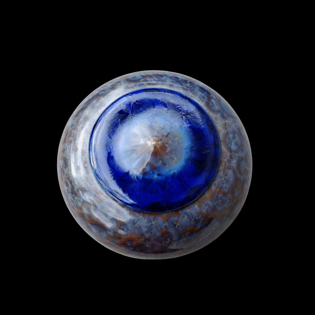 What makes this urn stand out is its unique glazing – a concentration of crystals in shades of deep navy blue and warm brown, creating unique patterns. The navy blue background resembles the night sky or calm sea waves, and the brown accents scattered on it add warmth and earthiness. The crystal structures created in the firing process form organic, unpredictable patterns – each urn is one of a kind, like the imprint of a beloved pet's paw, which cannot be copied.