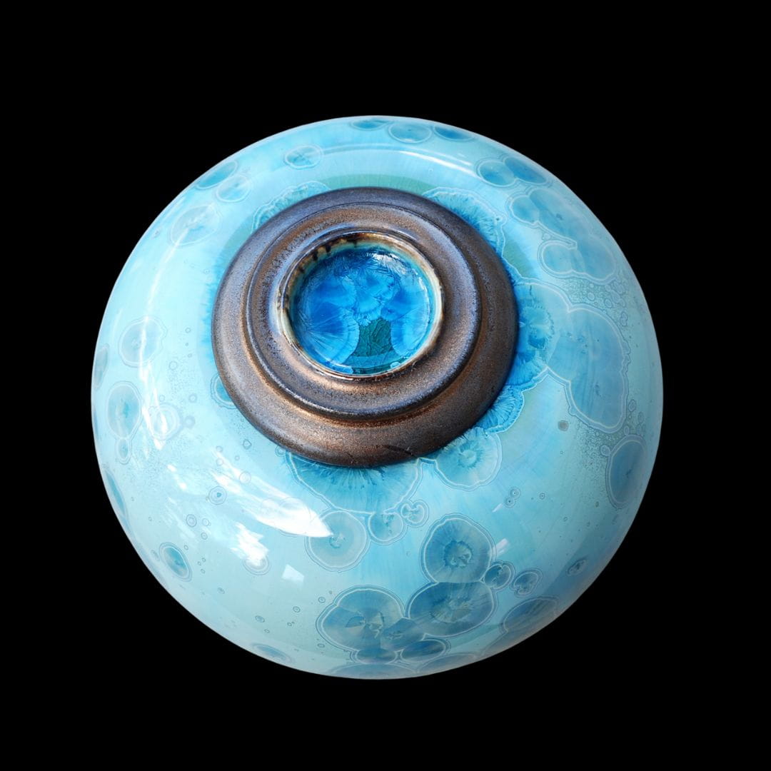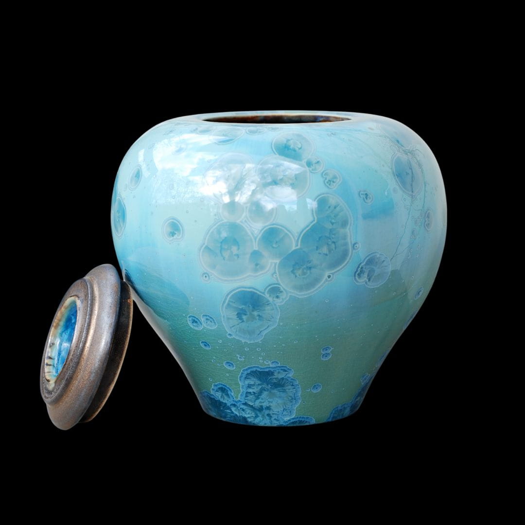 What makes the urn stand out is its proprietary crystal glaze, developed according to unique recipes. The high firing temperature allows for the creation of extraordinary, organic patterns, reminiscent of ethereal ice formations or subtle, floating clouds. The blue and azure reflections on the surface of the urn create a harmonious play of colors - from delicate pastel blue to deep, saturated shades of the sky. Each piece differs in the arrangement of crystal structures, which makes it absolutely unique.