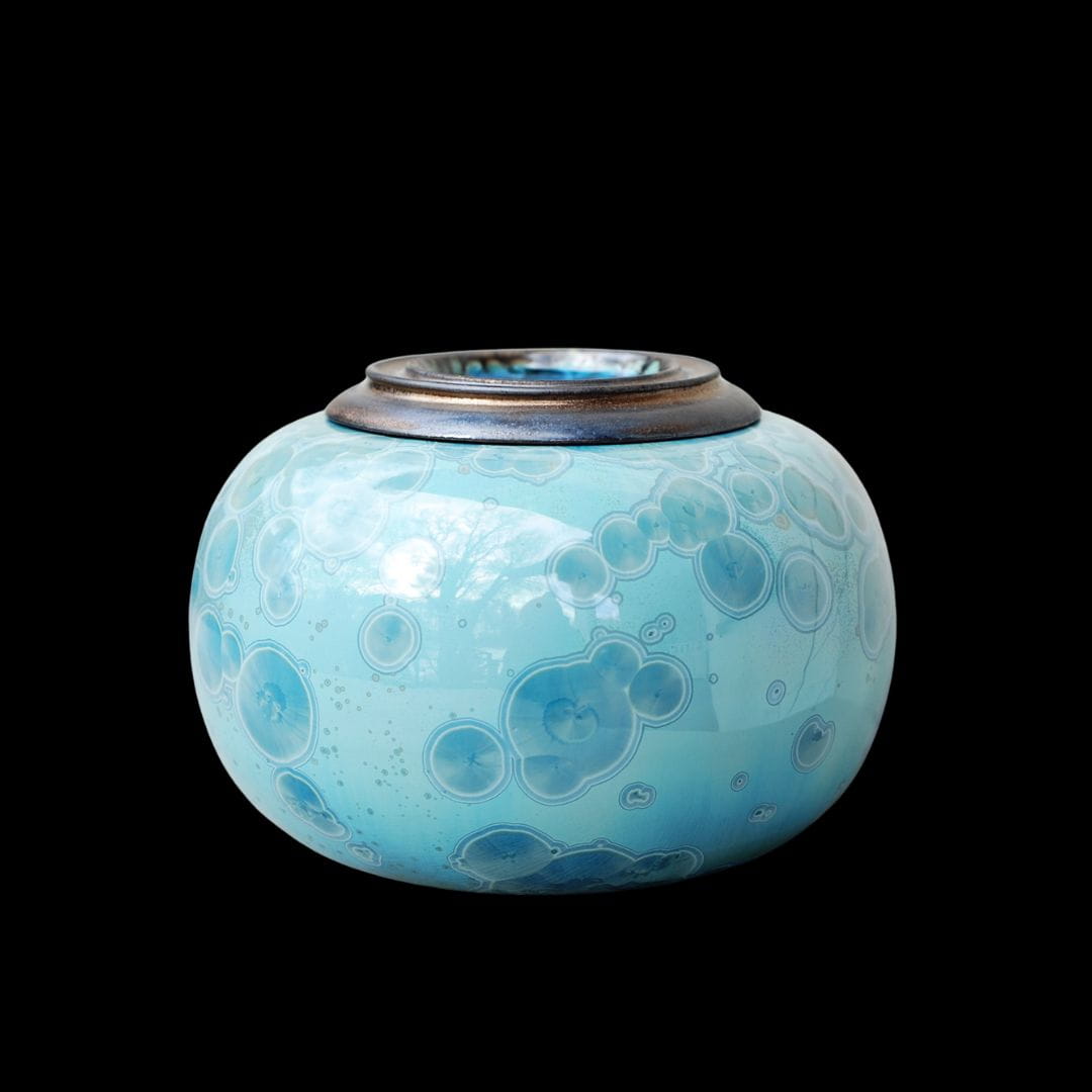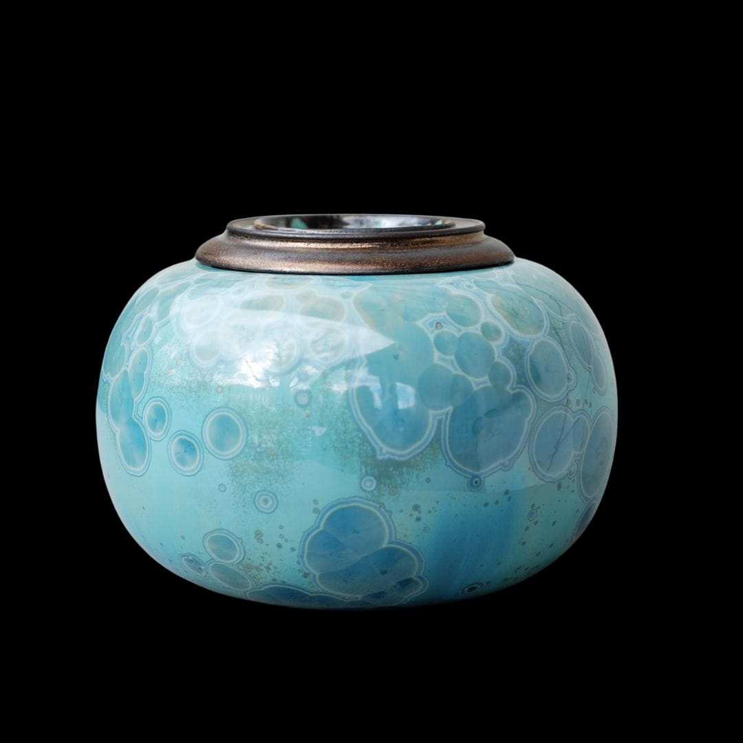 What gives each urn its unique character are the original crystal glazes, developed according to unique recipes. The surface of the urn shimmers with delicate shades of blue - from light, almost pastel tones, to deep, saturated colors reminiscent of a calm lake surface or an endless sky. Crystal patterns are arranged in organic, fluid structures that never repeat themselves - each urn is absolutely one of a kind.